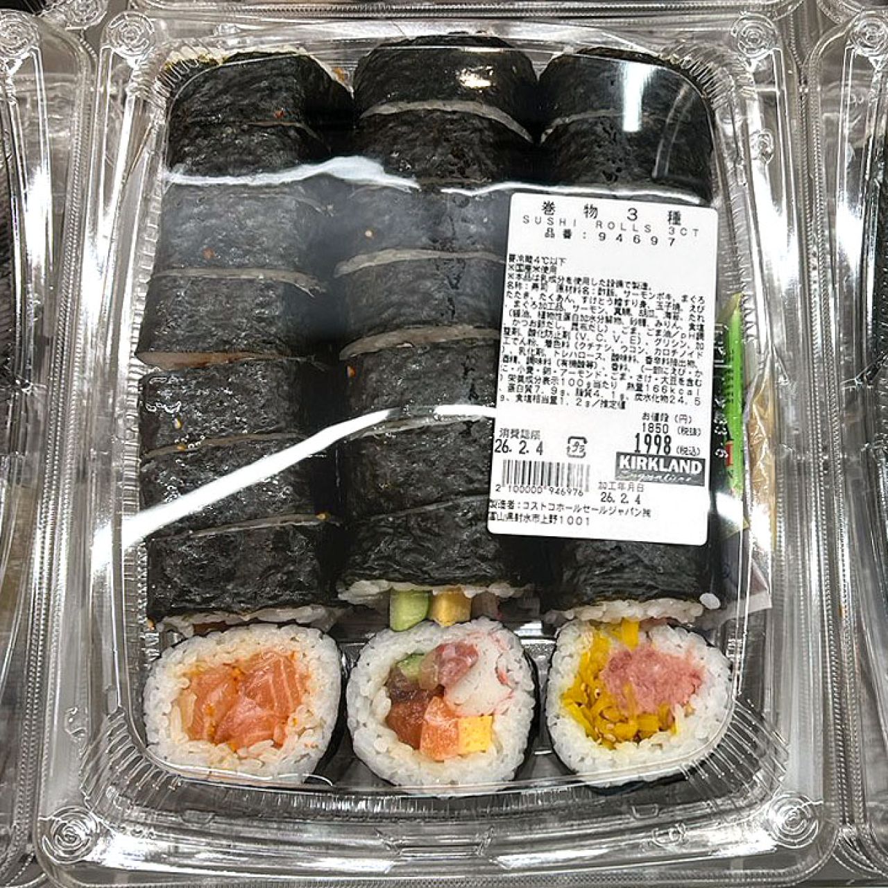 原材料名:田舎巻(酢飯(国産米使用)、巻芯(味付かんぴょう、味付椎茸、味付ごぼう、味付人参)、玉子焼、きゅうり、おぼろ、焼海苔)、サーモン巻(酢飯(国産米使用)、サーモン、焼海苔)、海鮮巻(酢飯(国産米使用)、サーモン、イカ、甘エビ、いくら醤油漬け、ごま、焼海苔、大葉、本みりん、ごま油、醤油)、ネギマグロ巻(酢飯(国産米使用)、まぐろたたき加工品、きゅうり、ねぎ、焼海苔、大葉)、調味料(アミノ酸等)、グリシン、ソルビット、pH調整剤、加工デンプン、着色料(カラメル、コチニール)、リン酸塩(Na)、酸化防止剤(V.C、V.E)、(原材料の一部に小麦を含む)